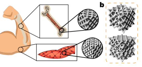 中國科學(xué)院福建物質(zhì)結(jié)構(gòu)研究所面向輕量化3D打印結(jié)構(gòu)在鞋業(yè)和汽車等領(lǐng)域的應(yīng)用開展研究。受自然界生物結(jié)構(gòu)兼具剛度和柔韌性的特征啟發(fā),科研人員通過分級彎曲和拉伸主導(dǎo)的結(jié)構(gòu)來設(shè)計混合架構(gòu)的晶格。進一步,該工作使用純樹脂及高二氧化硅固含的復(fù)合材料,采用3D打印方式制備了以上晶格結(jié)構(gòu),并將結(jié)果與理論分析數(shù)據(jù)進行比較以驗證設(shè)計合理性。